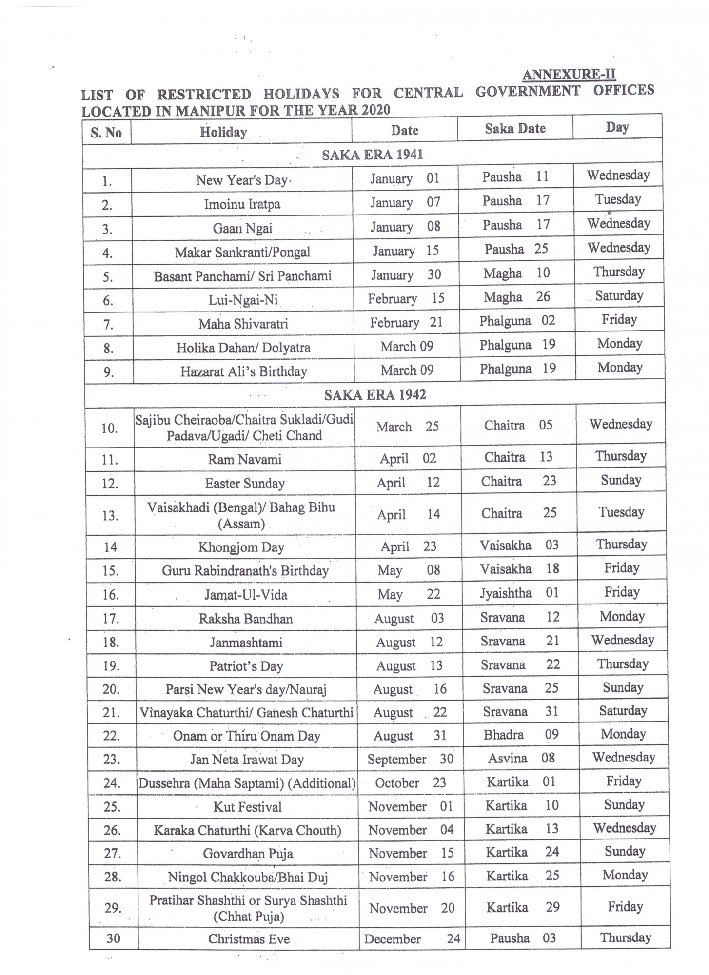 holiday list
