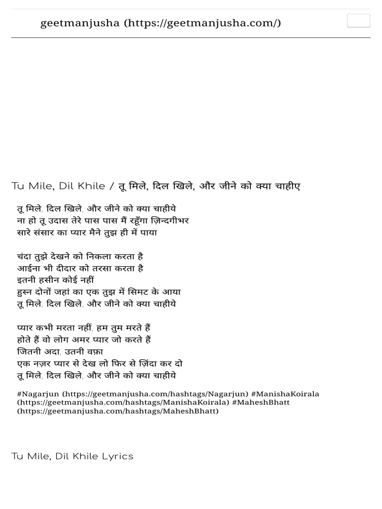 tu mile dil khile lyrics