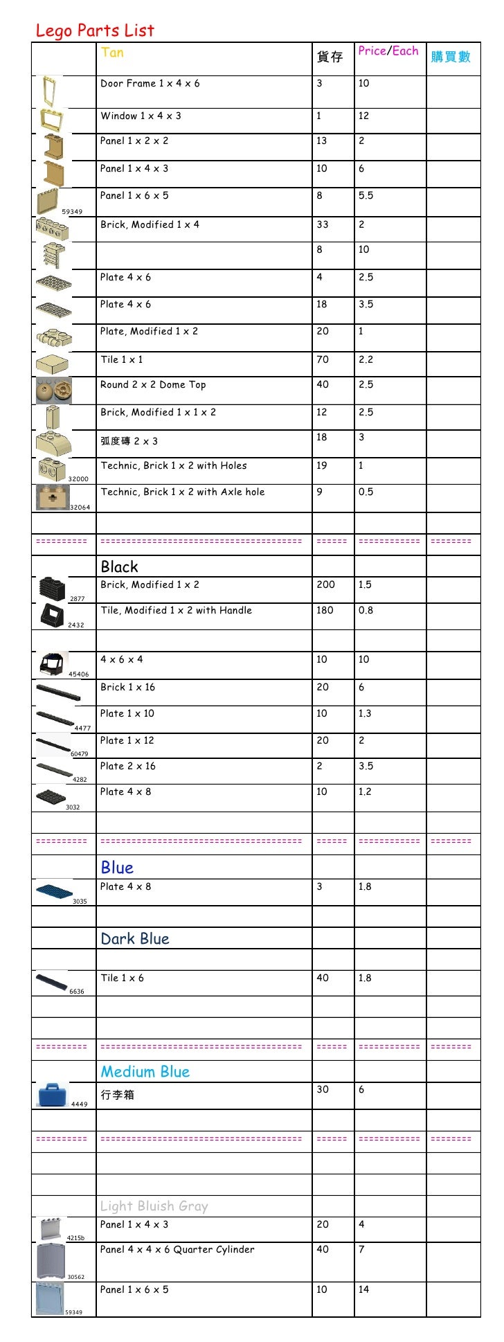 all lego parts list