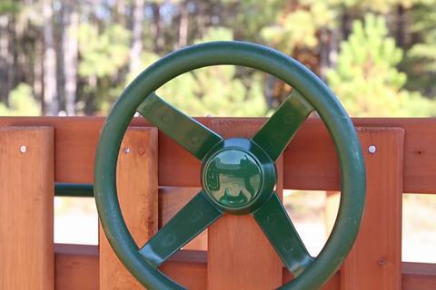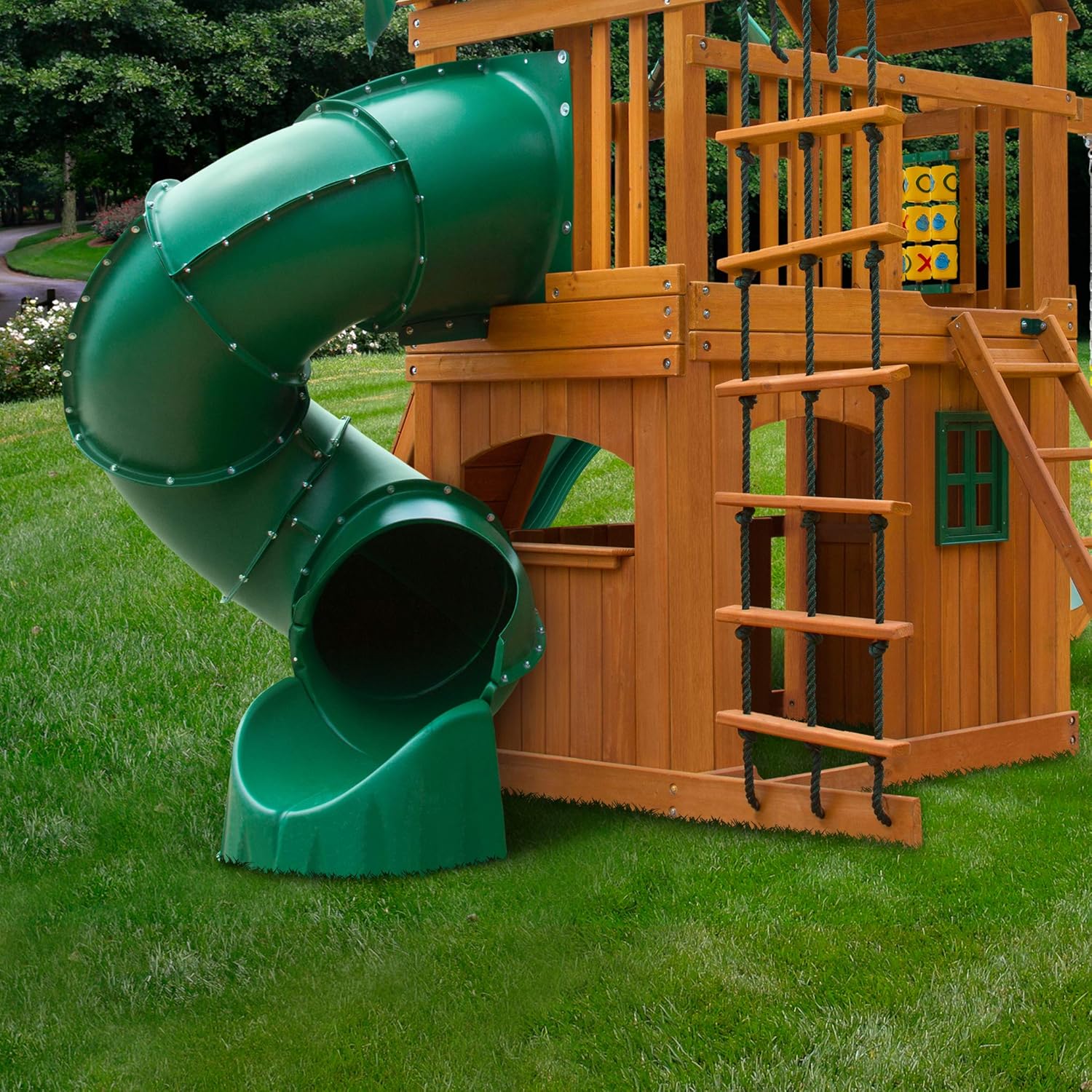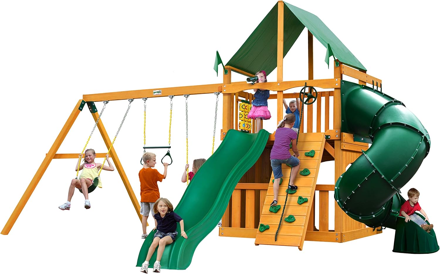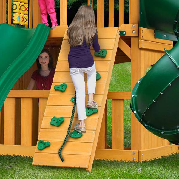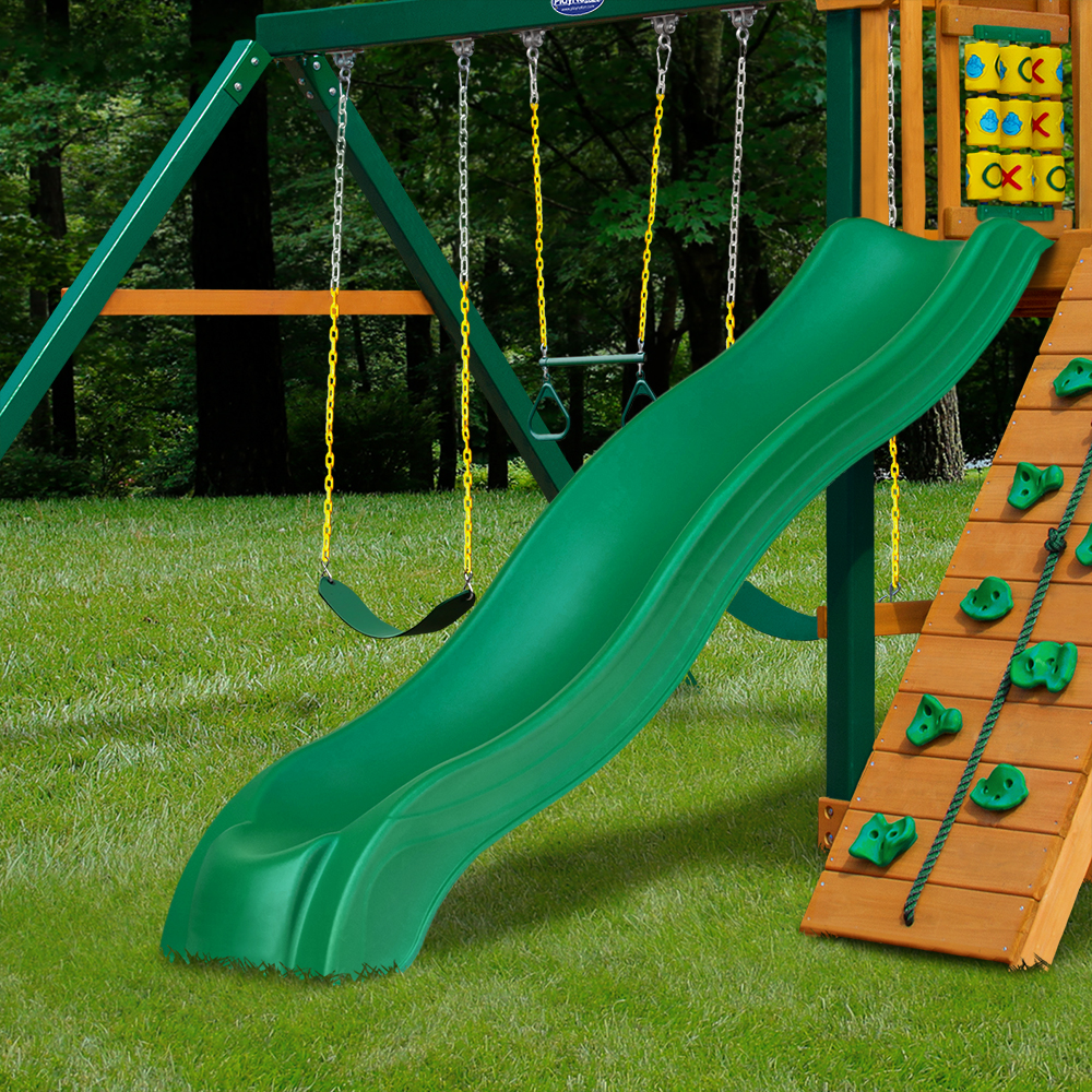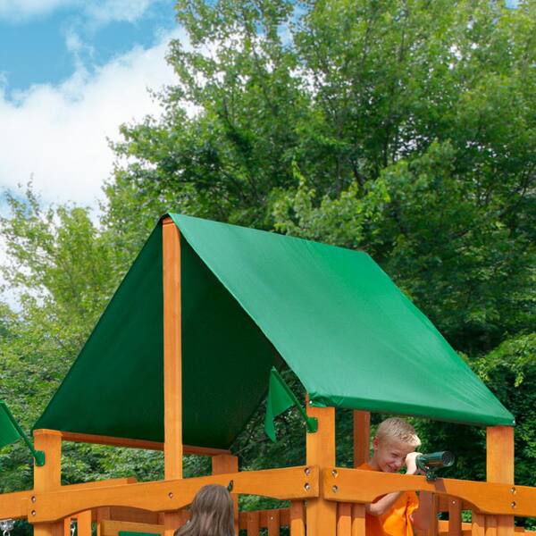 mountaineer cedar swing set with green vinyl canopy and natural cedar posts